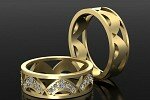 Обручальные кольца «Прелюдия к счастью»Предвкушение счастья – волшебное ощущение, дар судьбы будущим супругам. Всего один шаг предстоит молодоженам к их полному единению, обладанию друг другом, созданию своего прекрасного мира. Символом этого главного для молодой семьи шага станут обручальные кольца в оригинальном исполнении. Несколько золотых полос словно свиваются вместе, образуя притягательные очертания драгоценных изделий. На женском кольце по диагонали, словно вплетаясь в золотой жгут, размещен ряд блестящих прозрачных вставок, прекрасно подчеркивающих золотистое сияние или белое мерцание выбранного вами металла.